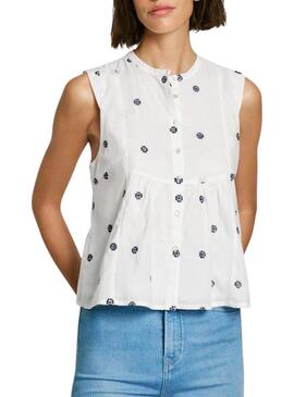 Maglietta Pepe Jeans. Modello Elvire. Colore bianco. Collo rotondo. Chiusura con bottoni. Senza maniche. Taglio peplum. Tessuto ricamato con dettagli etnici in blu scuro.