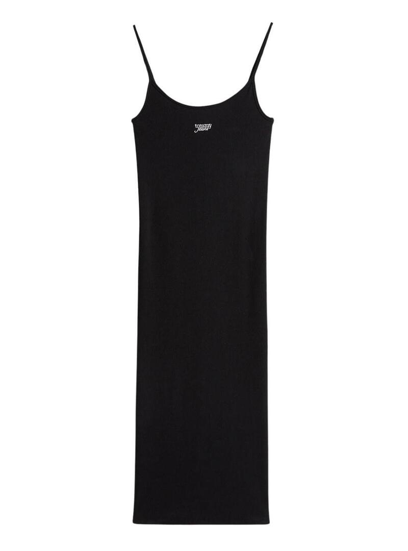 Abito Tommy Jeans. Modello Script Strap. Colore nero. Lunghezza midi. Tessuto elastico. Logo ricamato in filo bianco sul petto. Tessuto a coste. Taglio aderente. Abito a spalline sottili.
