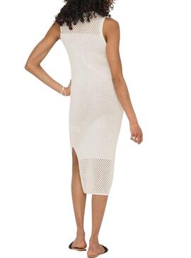 Abito Only. Modello Lalula. Colore beige. Scollo rotondo. Senza maniche. Scollatura a cuore simulata. Lunghezza midi. Apertura laterale. Tessuto a maglia traforata. Effetto fodera.
