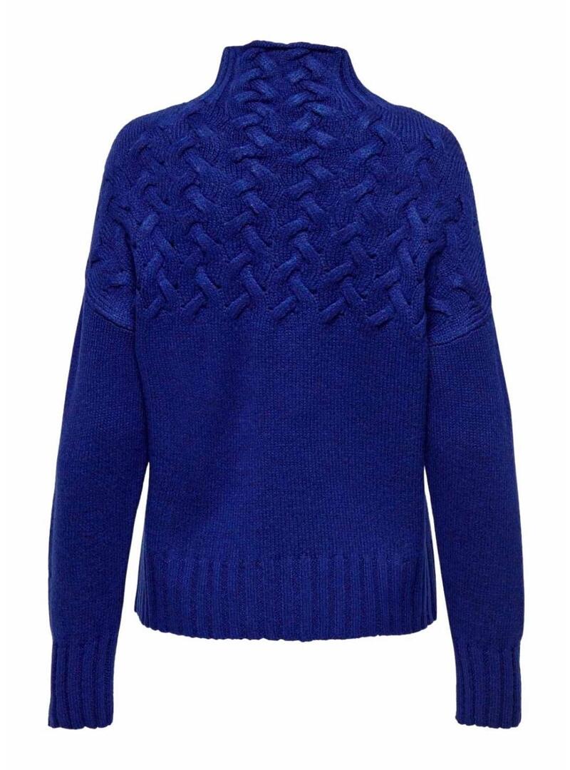 Solo maglia. Colore bluastro. Collo alto. Maniche lunghe. Spalle cadenti. Finiture a coste. Dettaglio a maglia intrecciata nella parte superiore. Il modello indossa la taglia S.