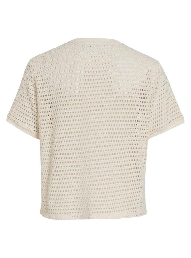 Maglietta Vila. Modello Viellete. Colore rosa. Tessuto di raso non elastico. Collo rotondo. Manica corta con risvolto. Vestibilità regolare. Il modello indossa la taglia 36.