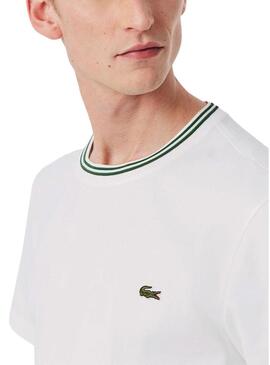 Maglietta Lacoste. Colore bianco. Collo rotondo con banda verde. Manica corta. Taglio regolare. Coccodrillo ricamato sul petto.