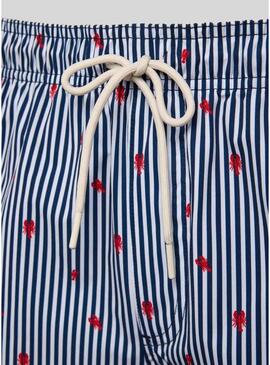 Costume da bagno Jack and Jones. Modello Maui Mini. Stampato a righe. Colore blu scuro e bianco. Dettagli in rosso. Vita elastica con lacci. Patch con logo.