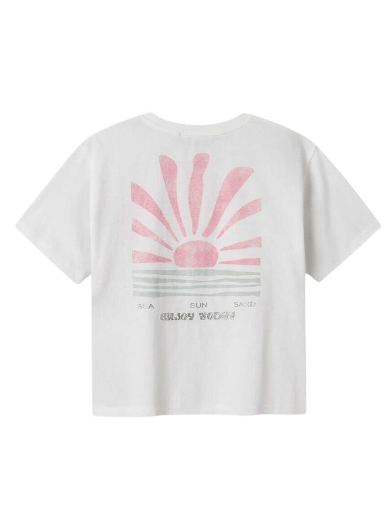 Maglietta Name It. Modello Jely. Colore bianco. Collo rotondo. Manica corta. Vestibilità quadrata. Illustrazione stampata sul petto e sulla schiena. Dettagli in rosa.