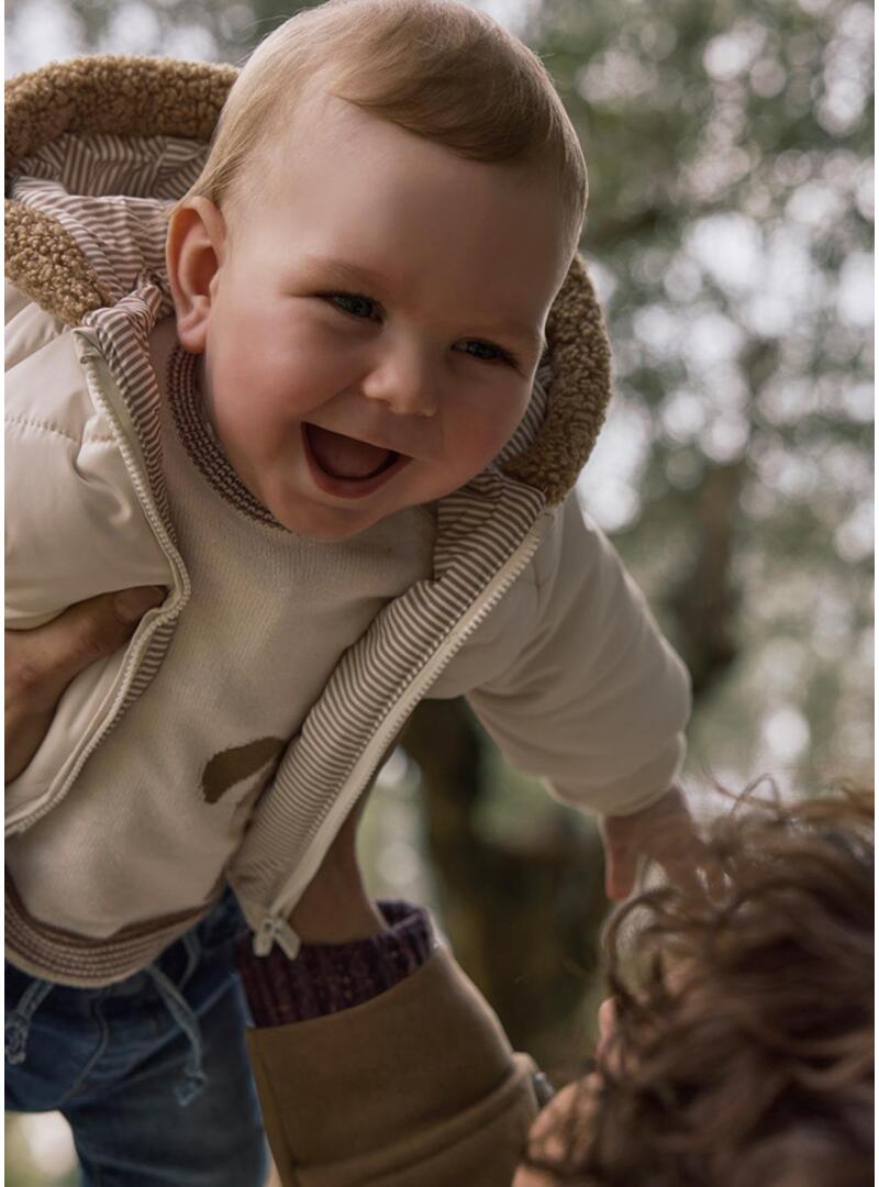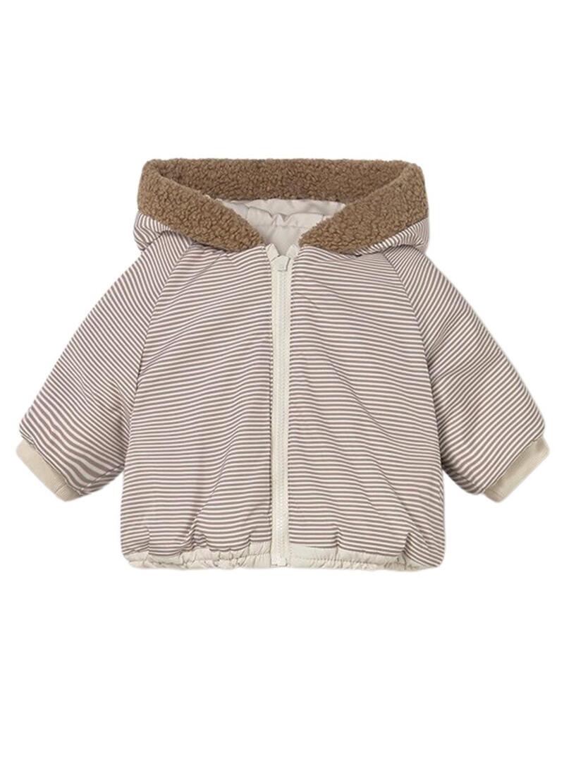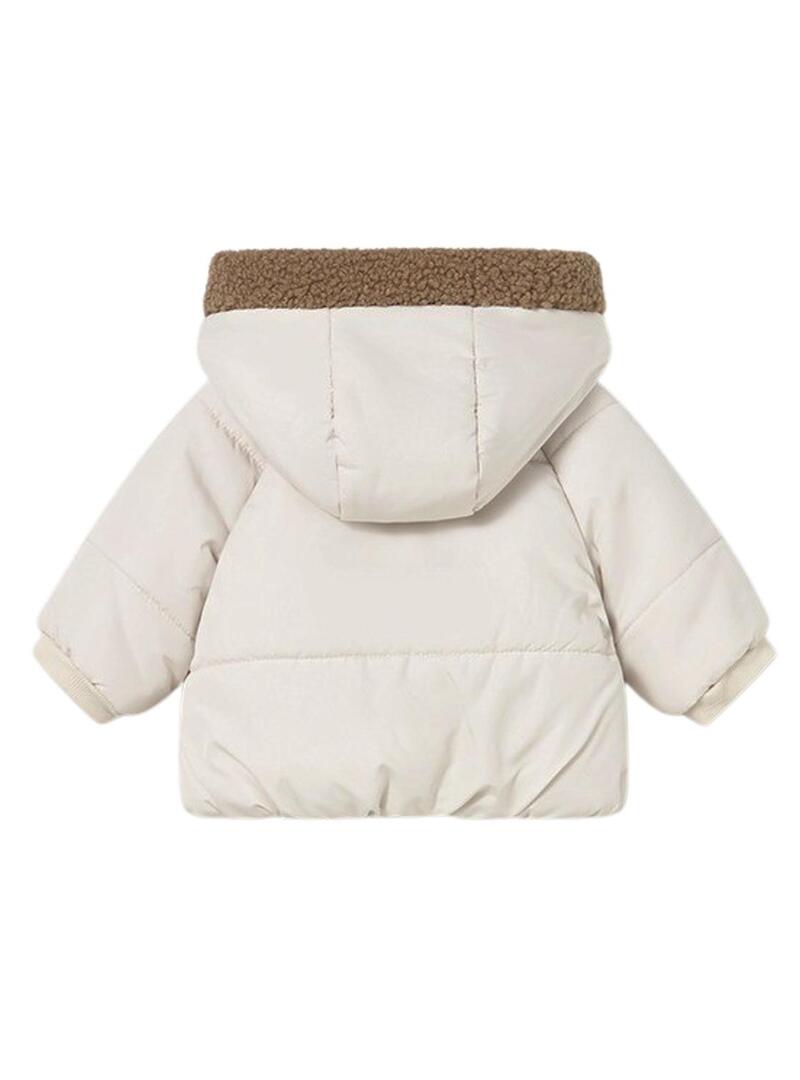 Giaccone Mayoral. Colore beige. Manica lunga. Per neonato. Cappuccio con dettagli di pelliccia. Chiusura anteriore con zip. Esterno in tessuto trapuntato. Interno a righe.