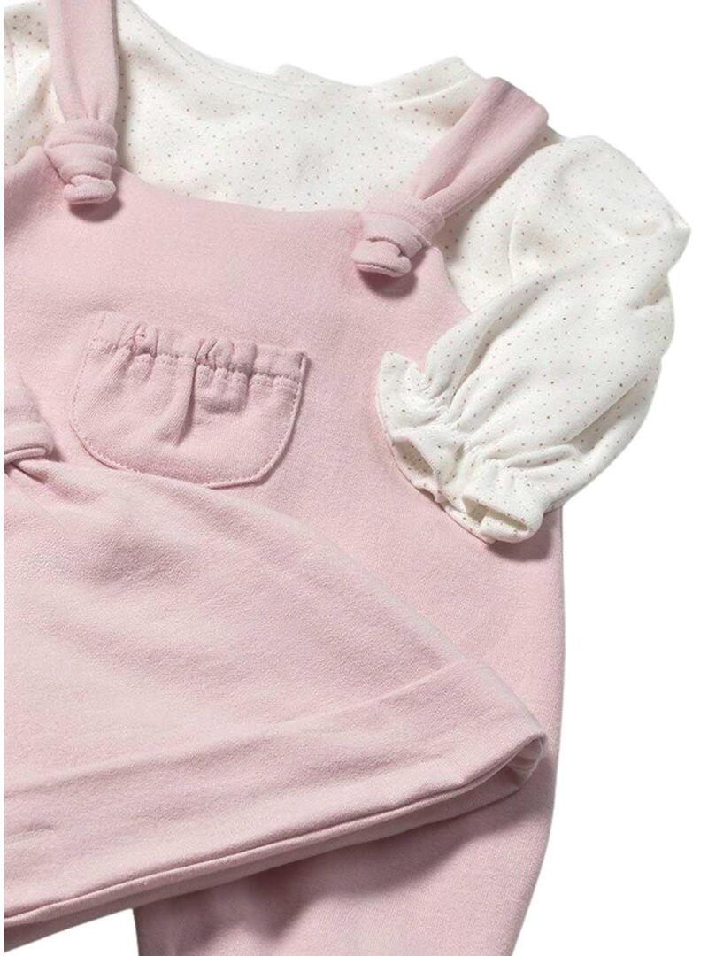 Set Mayoral 2 pezzi. Colore rosa. Tuta con maniche lunghe. Per neonato. Salopette con maglietta sovrapposta. Chiusura con bottoni nella parte posteriore. Bottoni a pressione nel cavallo. Fondo con piedi. Cappello rosa. Tessuto morbido.