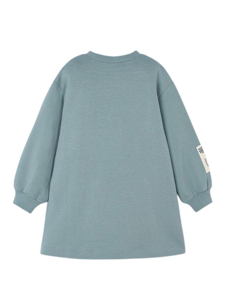 Vestito Mayoral. Colore blu. Manica lunga. Collo rotondo. Tessuto morbido in cotone elasticizzato. Stampa sul davanti. Stampa su una manica. Taglio a trapezio.