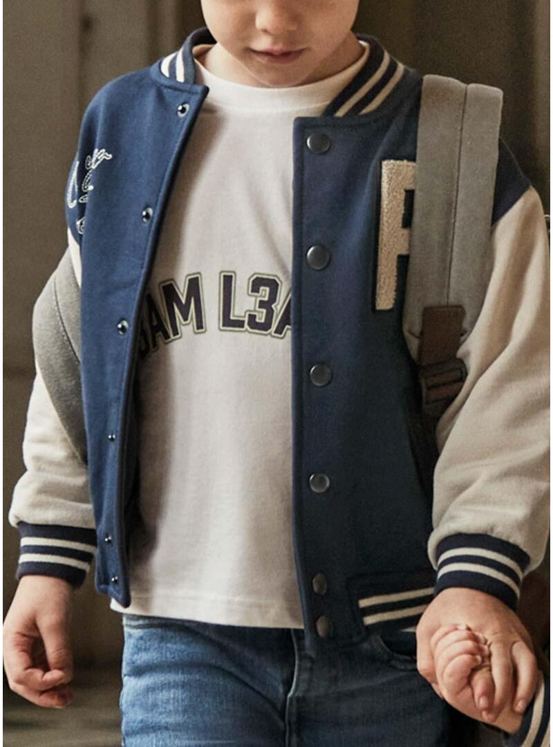 Bomber Mayoral. Colore blu. Finiture a coste. Maniche a contrasto. Dettaglio a righe. Ricami sulla parte anteriore. Chiusura con bottoni a pressione. Tasche frontali.