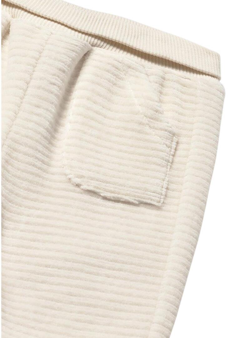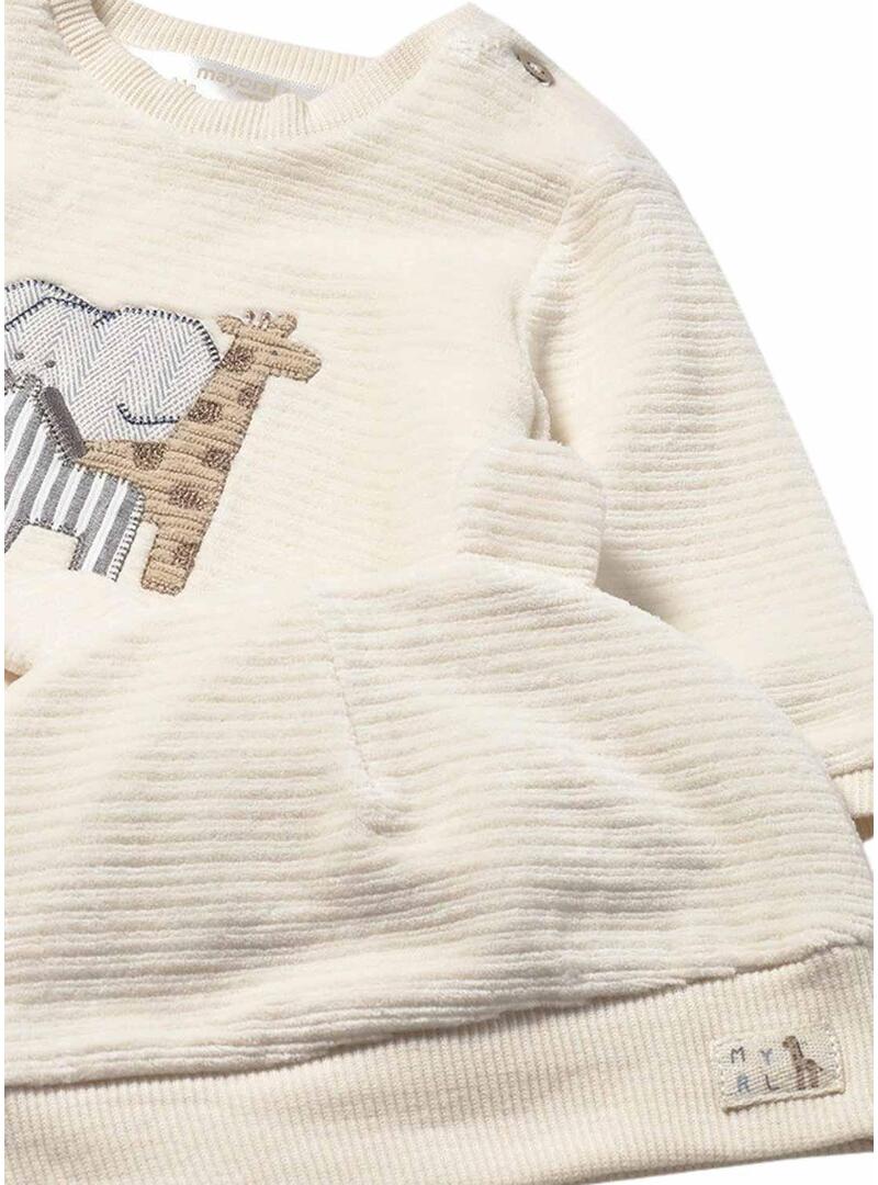 Tuta Mayoral. Colore beige. 3 pezzi. Tessuto a coste. Felpa a maniche lunghe. Collo rotondo. Stampa ricamata sul davanti. Pantaloni lunghi. Vita elastica. Con tasche. Cappello con orecchie.