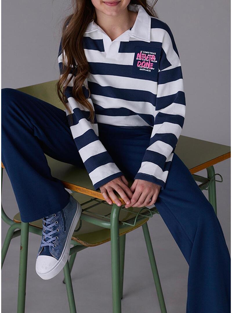 Set Mayoral. Polo a righe stampate. Ricamato sul petto. Manica lunga. Taglio largo. Pantaloni blu. Lunghezza standard. Vita elastica. Gamba larga.