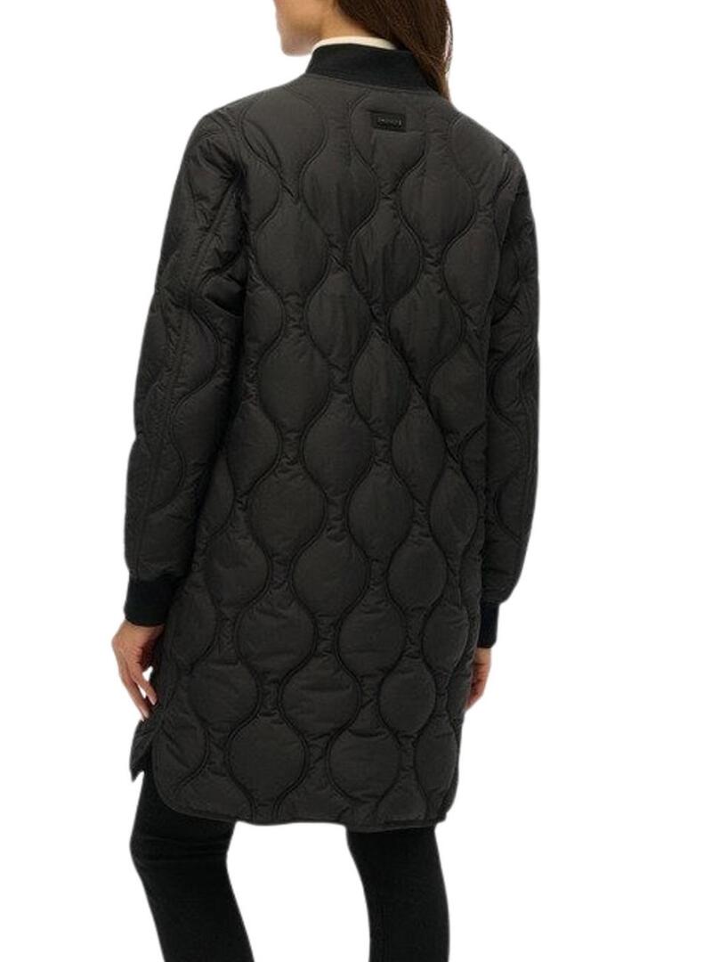 Parka Superdry. Modello trapuntato. Colore nero. Colletto stile bomber a costine. Chiusura con zip bidirezionale. Imbottitura geometrica. Tasche laterali. Taglio lungo. Vestibilità dritta. Tessuto leggero.