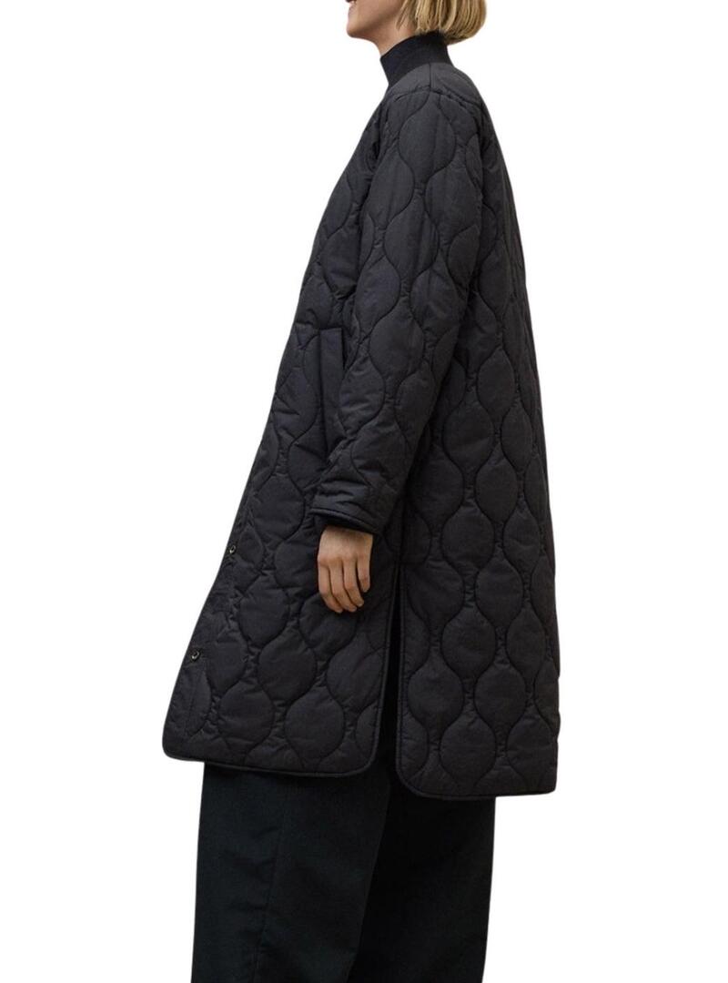 Cappotto Ecoalf. Modello Tiago. Colore nero. Stile reversibile. Interno trapuntato geometrico vegano. Colletto bomber a costine. Tasche laterali. Chiusure con bottoni a pressione. Patch del marchio. Aperture laterali. Lunghezza alle ginocchia. Resistente all'acqua.