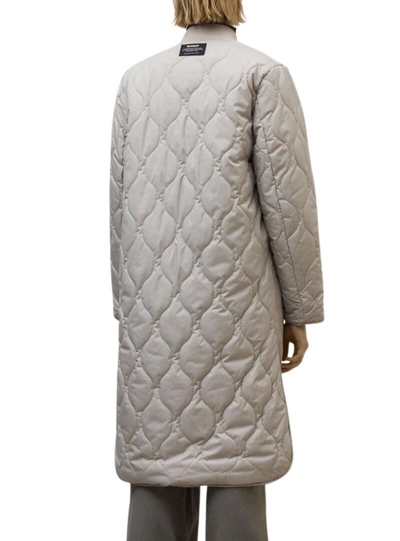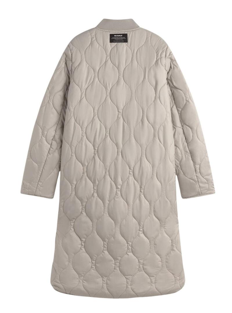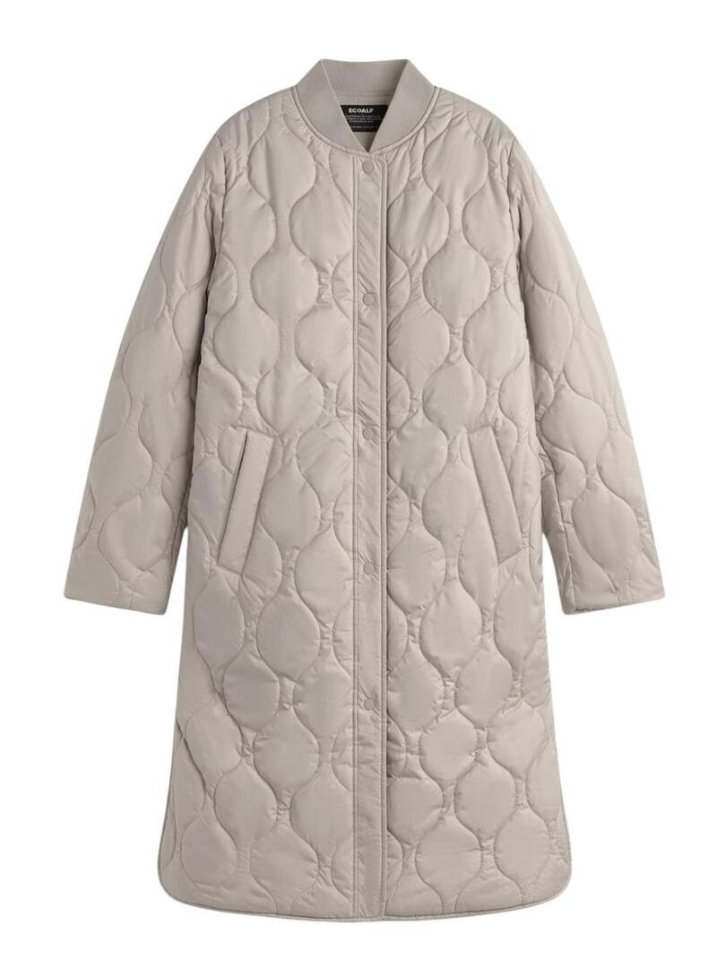Ecopelliccia Ecoalf. Modello Tiago. Colore beige. Stile reversibile. Interno trapuntato geometrico vegano. Colli a costine di bombetta. Tasche laterali. Chiusure con bottoni a pressione. Patch del marchio. Aperture laterali. Lunghezza fino al ginocchio. Resistente all'acqua.