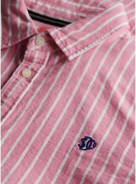 Maglietta Superdry. Modello Oxford. Colore rosa e bianco. Tessuto a righe verticali. Colletto da camicia. Chiusura con bottoni. Vestibilità slim. Logo ricamato sul petto in colore blu.