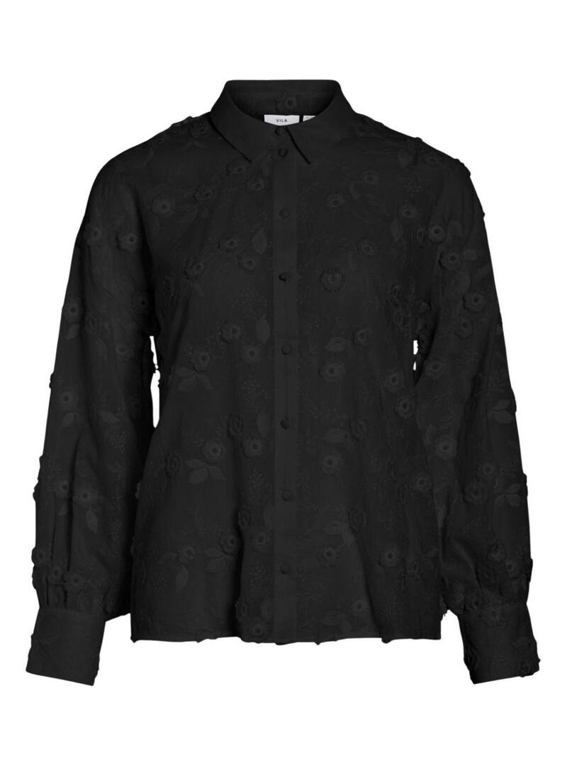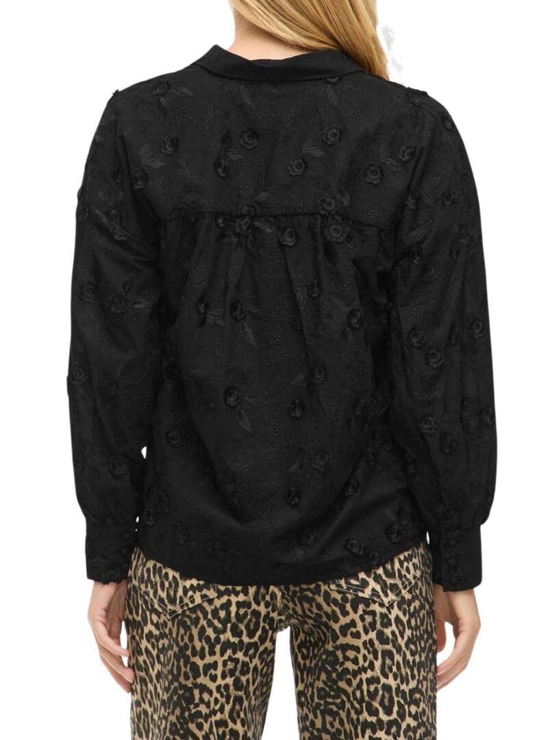 Camicia Vila. Modello Visimone. Colore nero. Tessuto con fiori ricamati tono su tono. Vestibilità regolare. Manica con leggero volume. Chiusura con bottoni tono su tono.