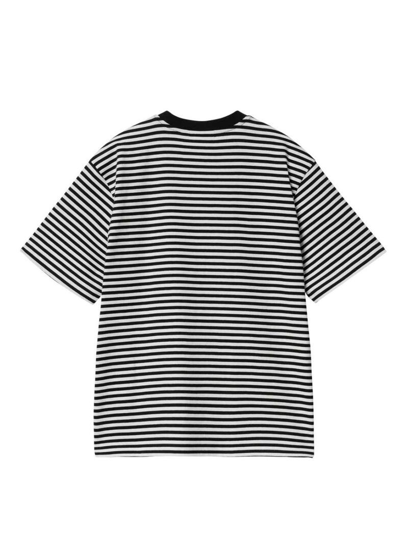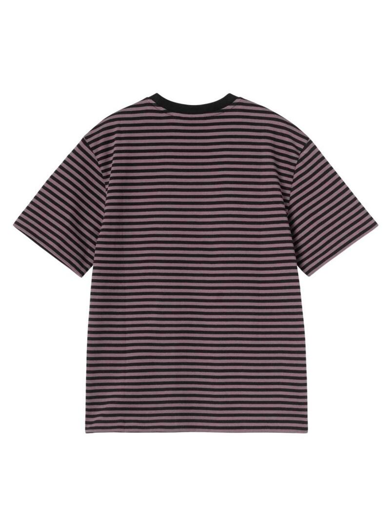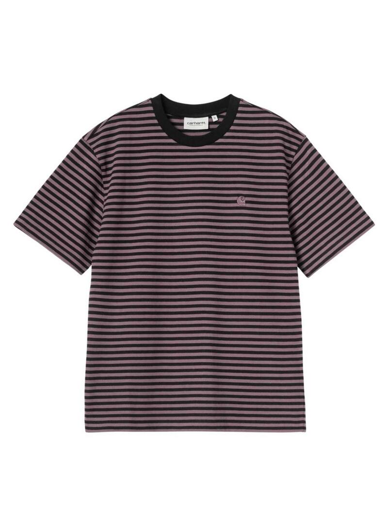 T-shirt Carhartt. Modello Verner. Colore rosa e nero. Logo ricamato sul petto. Taglio quadrato. Tessuto a righe orizzontali. Manica corta.