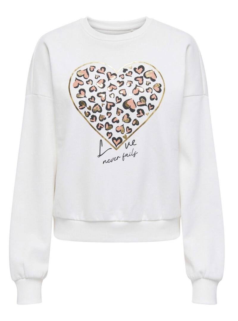 Felpa Only. Modello Tammie. Colore bianco. Cuore stampato sul petto con dettagli dorati. Collo rotondo. Orli a coste. Vestibilità ampia. Spalle cadenti.