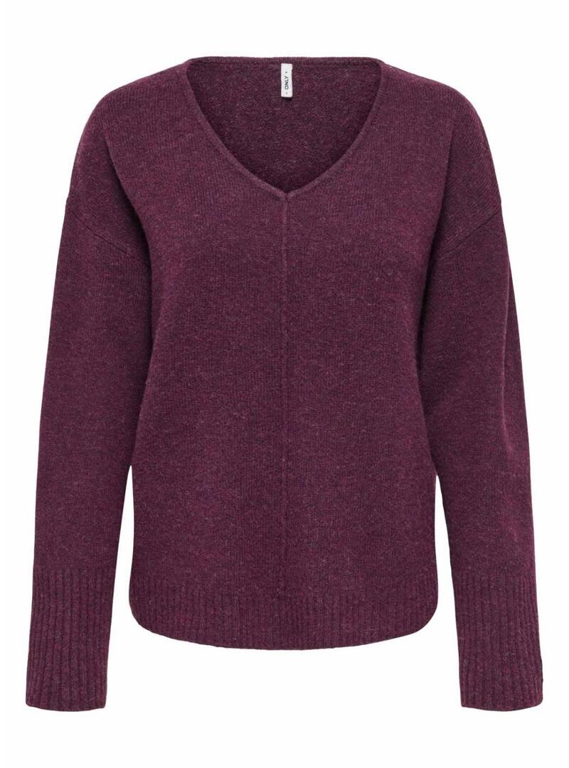 Maglia Only. Modello Whitney. Colore granata. Scollo a V. Cucitura centrale. Orli a coste. Vestibilità oversize. Spalle cadenti. Tessuto morbido al tatto.