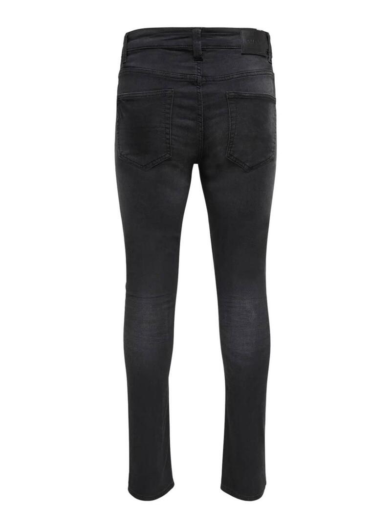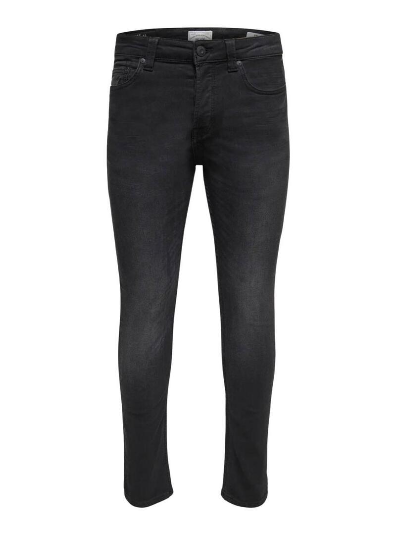 Pantaloni in denim Only and Sons. Modello Loom. Denim nero. Effetto consumato. Patch del marchio in vita. Taglio slim fit. Aderente sulla gamba. Cinque tasche. Chiusura con bottone e zip.