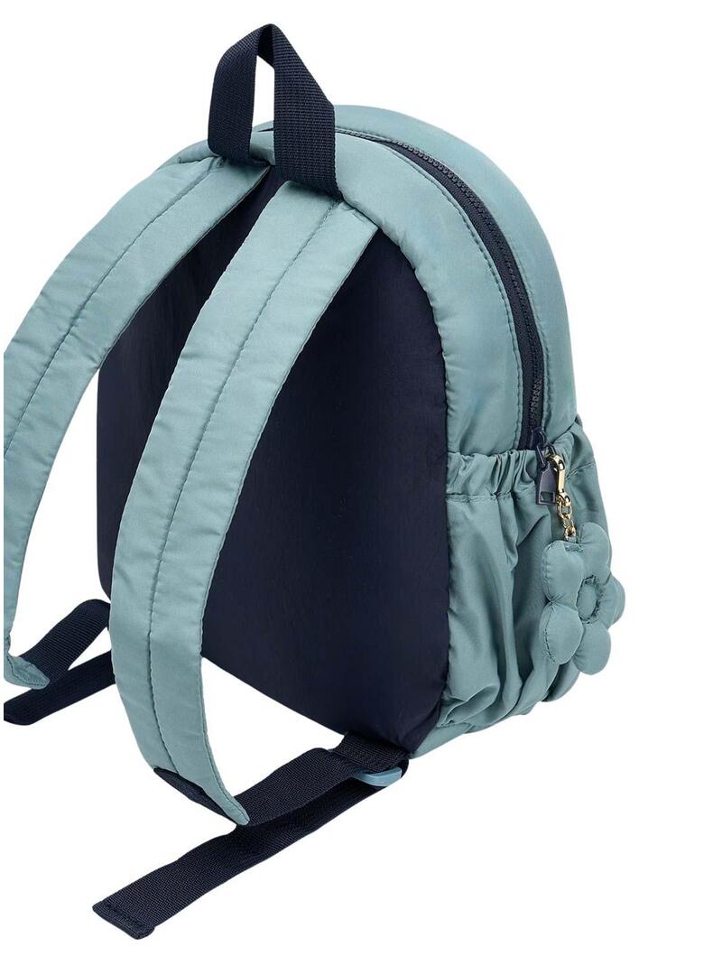 Zaino Mayoral. Colore verde. Chiusura superiore con cerniera. Parte anteriore imbottita. Tasca anteriore con stampa a quadretti. Tasche laterali. Manico superiore in contrasto. Due manici regolabili. Fiore decorativo rimovibile.