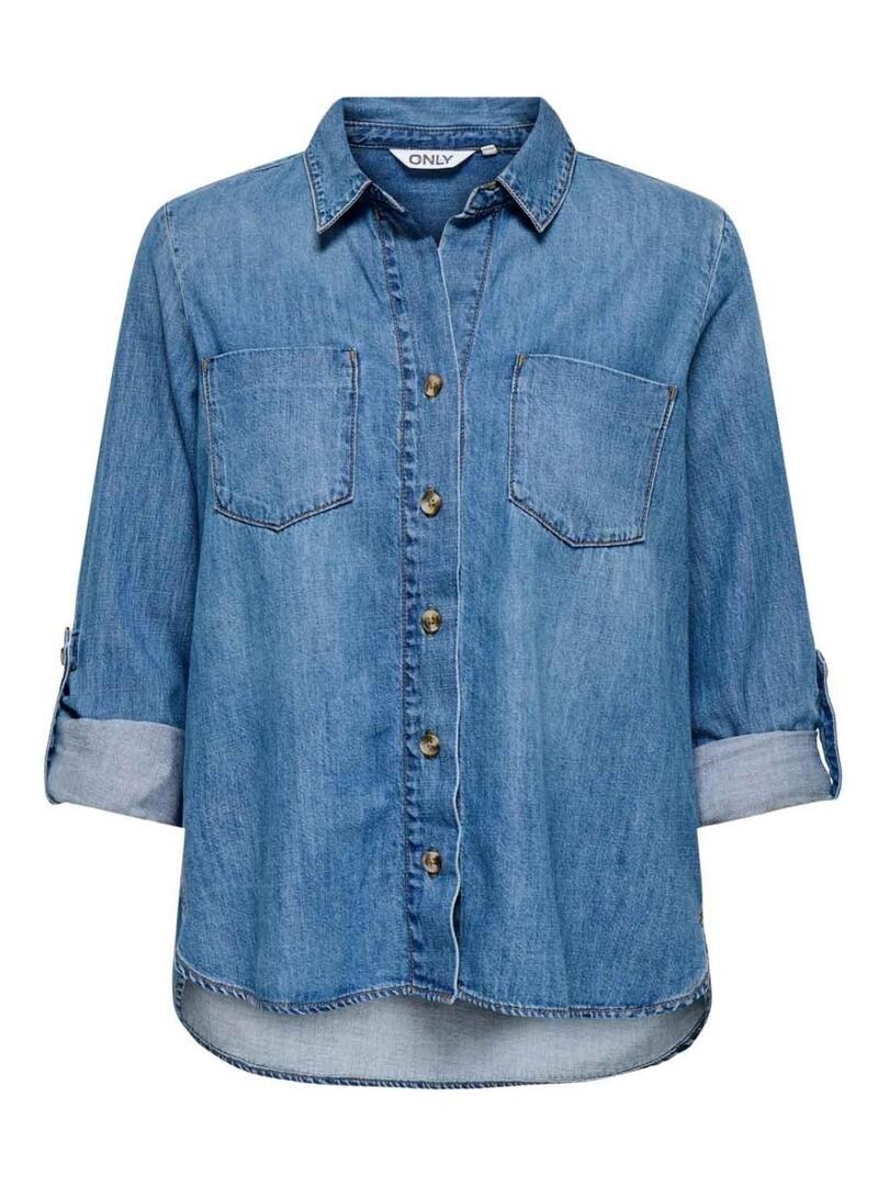 Camicia Only. Modello Yasmin. Tessuto in denim leggero. Chiusura con bottoni. Scollo a V. Colletto da camicia. Manica regolabile con bottone. Parte posteriore più lunga rispetto a quella anteriore. Effetto lavato. Tasche a toppa sul petto.