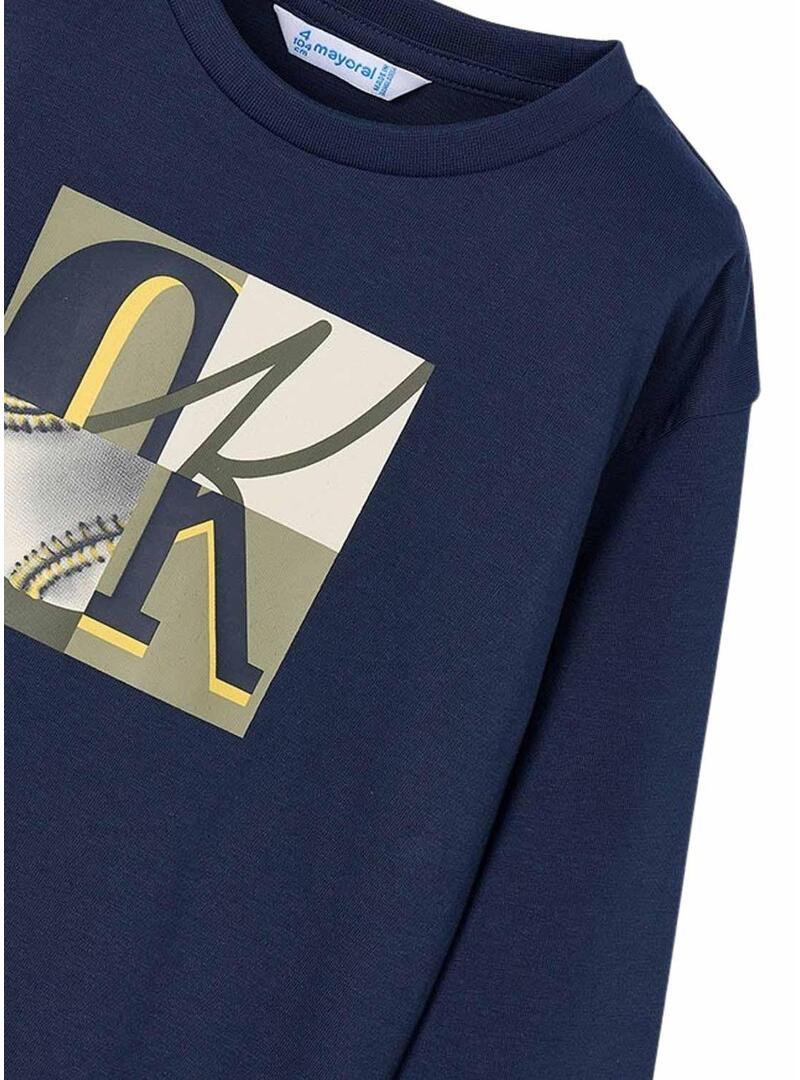 Maglietta Mayoral. Colore marino. Manica lunga. Collo rotondo. Stampa sul petto. Dettaglio in rilievo.