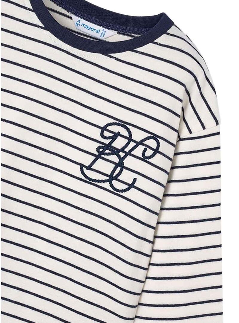Maglietta Mayoral. Stampato a righe. Manica lunga. Collo rotondo. Ricamato sul petto. Colletto a contrasto.