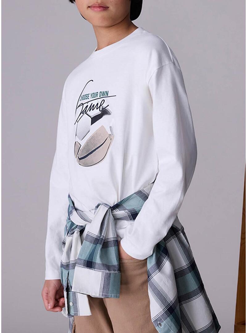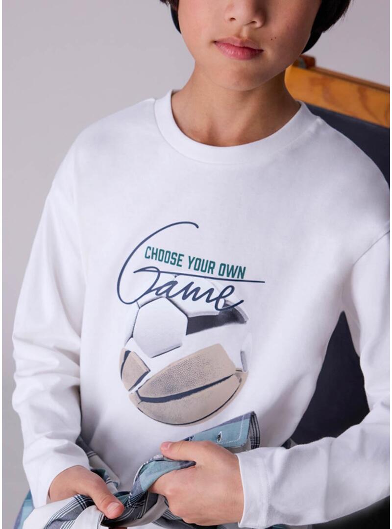 Maglietta Mayoral. Colore bianco. Manica lunga. Collo rotondo. Stampato sul petto. Capo con un codice QR. Scansionando il QR avrai accesso a un videogioco esclusivo di Mayoral.