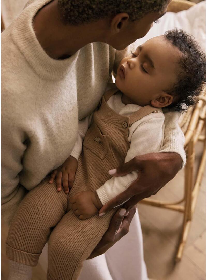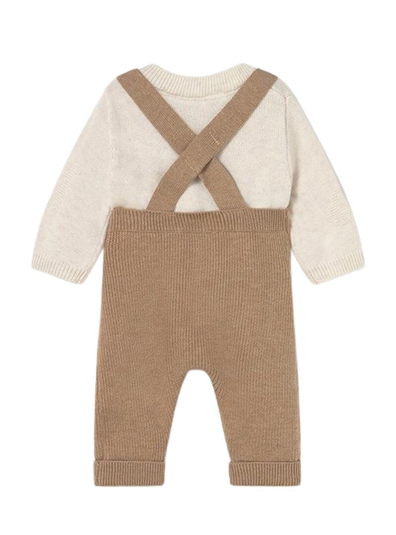 Set Mayoral. Salopette a maglia color marrone. Con bretelle. Tasca sul petto. Maglione a maglia. Colore beige. Manica lunga. Chiusura sul collo con bottoni.