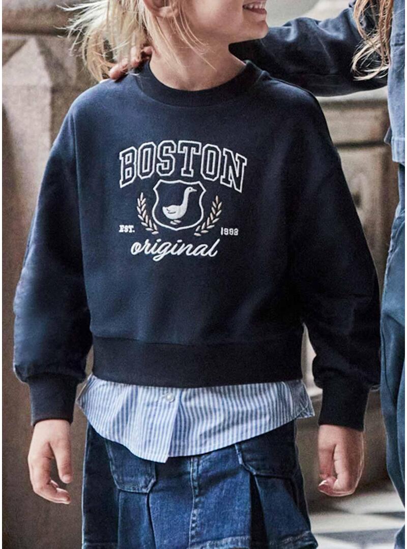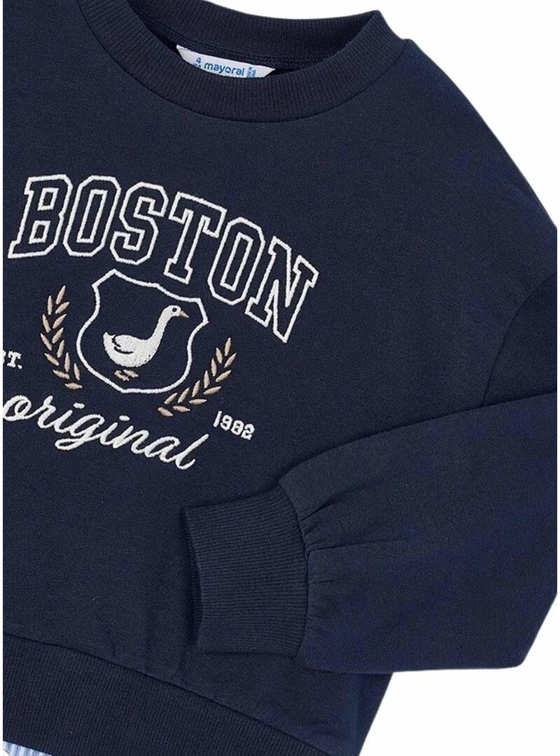 Felpa Mayoral. Colore blu scuro. Manica lunga. Collo rotondo. Tessuto misto. Fondo con effetto camicia. Ricamo sul petto.