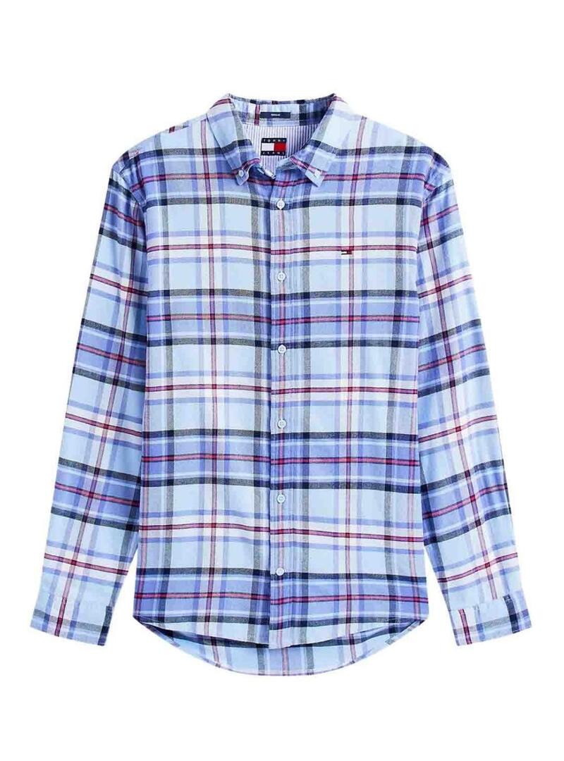 Camicia Tommy Jeans. Modello Flanella. Colore blu. Colletto abbottonato. Logo ricamato sul petto. Fondo arrotondato. Vestibilità regolare. Stampato geometrico in blu, rosso e bianco.