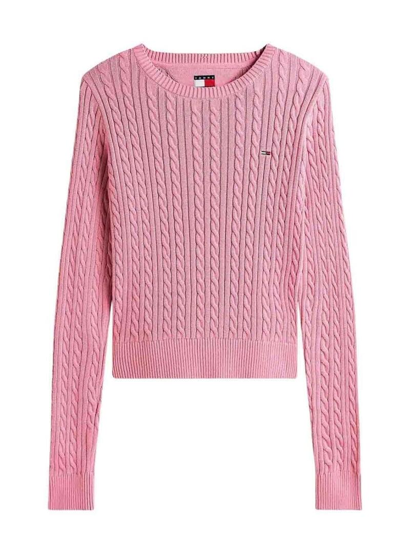 Maglia Tommy Jeans. Modello Cable. Colore rosa. Collo tondo. Orli a costine. Taglio aderente. Tessuto intrecciato. Logo ricamato sul petto.