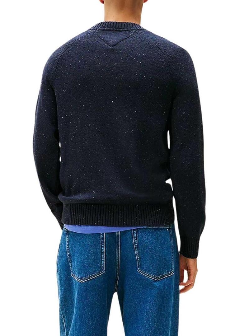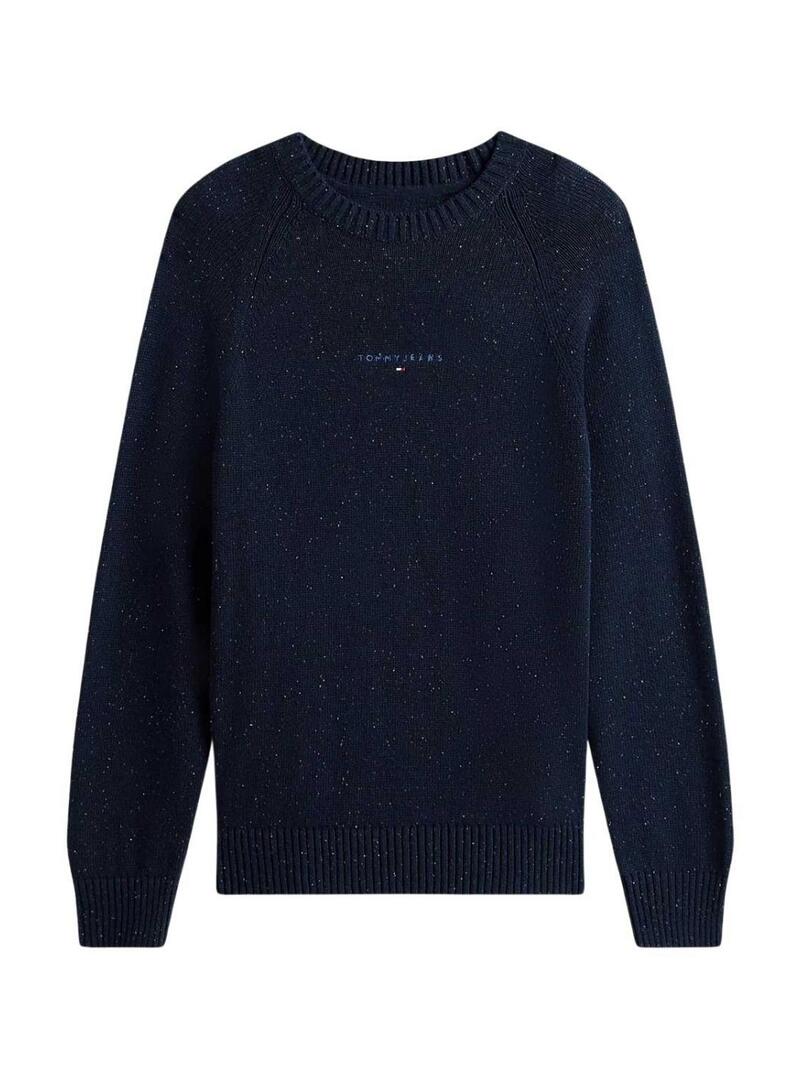 Maglia Tommy Jeans. Modello Slim Linear Logo. Colore blu scuro. Collo rotondo. Orli a costine. Logo ricamato sul petto. Manica a ragnatela. Tessuto con puntini colorati.