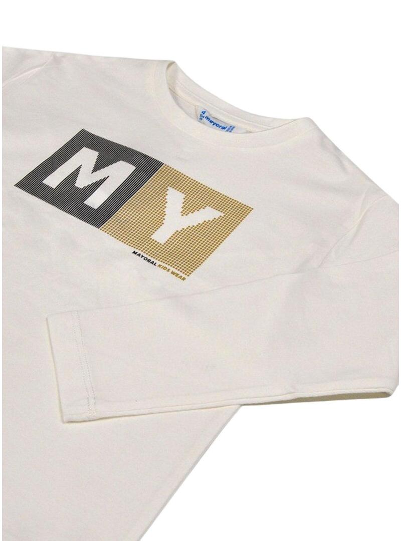 Maglietta Mayoral. Colore beige con stampa sul petto. Manica lunga. Collo rotondo.