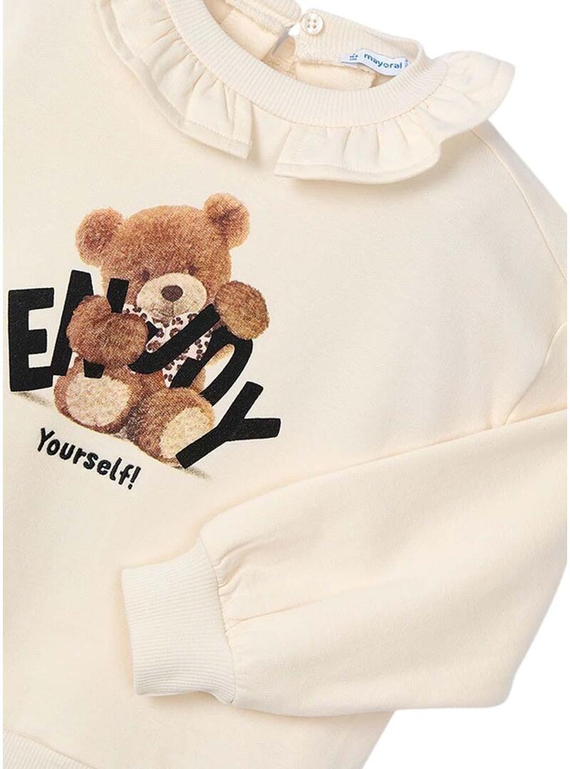 Felpa Mayoral. Manica lunga. Collo rotondo con volant. Chiusura con bottone sul collo. Fondo e polsini con punto elastico. Stampa sul petto. Dettaglio di lettere ricamate.
