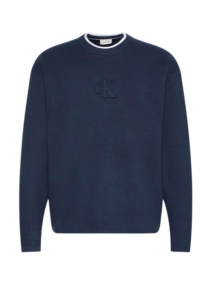 Maglia Calvin Klein. Girocollo. Manica lunga. Taglio ampio. Colore navy. Logo monogramma inciso sul petto. Orlo bianco sul collo. Finiture a costine.