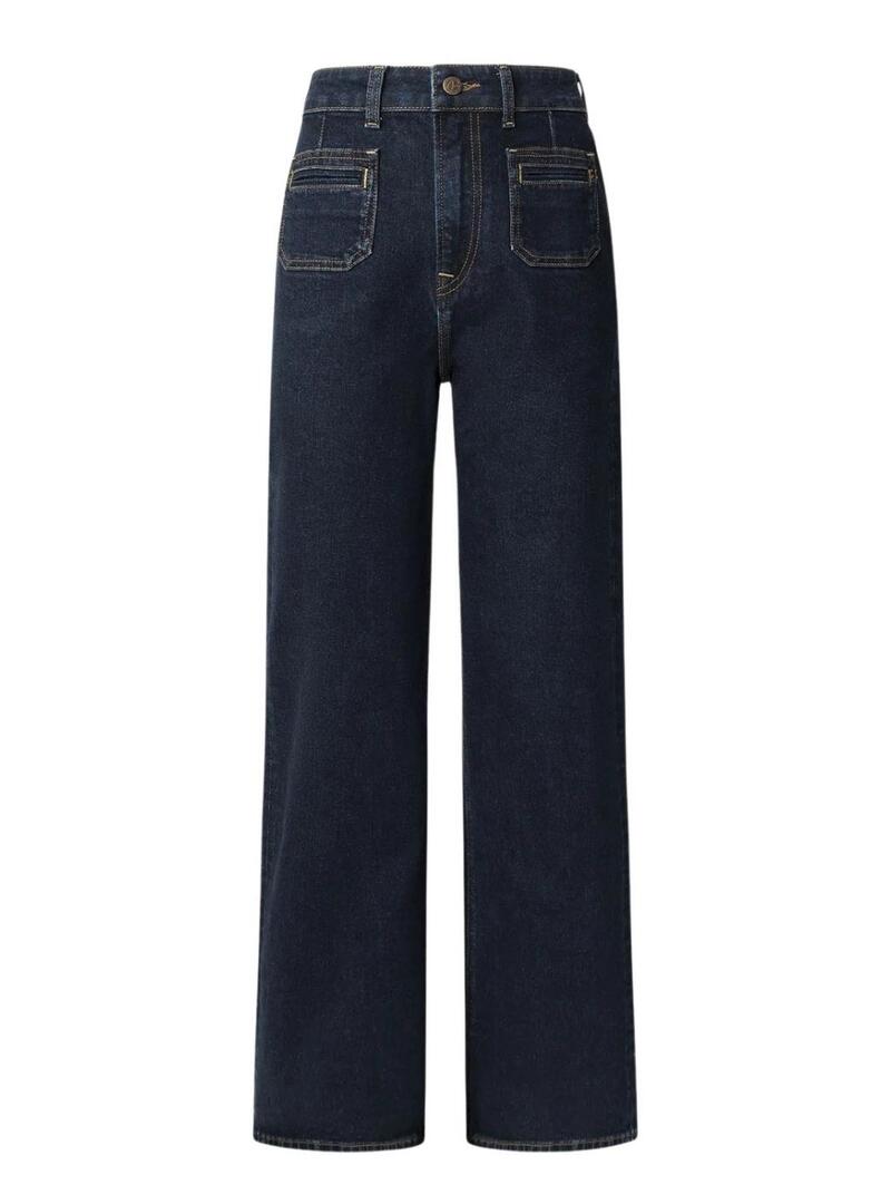 Jeans Pepe. Modello Lexa. Taglio dritto. Vita alta. Gamba dritta e ampia. Tasche anteriori a toppa. Dettaglio di cucitura sulle tasche posteriori. Cuciture in contrasto. Tessuto denim rigido. Targhetta con logo sulla tasca posteriore.