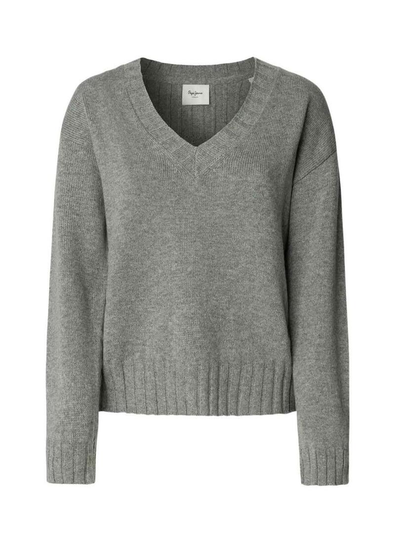 Maglia Pepe Jeans. Colore grigio. Maglia a maglia con misto lana. Scollo a V. Manica lunga. Spalle leggermente cadenti. Orli a costine. Logo Pepe Jeans in pointelle sul retro. Targhetta circolare in metallo con logo in basso. La modella indossa la taglia S.