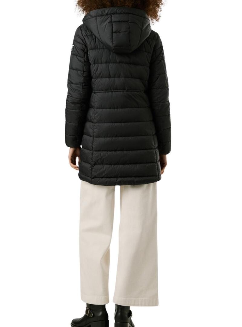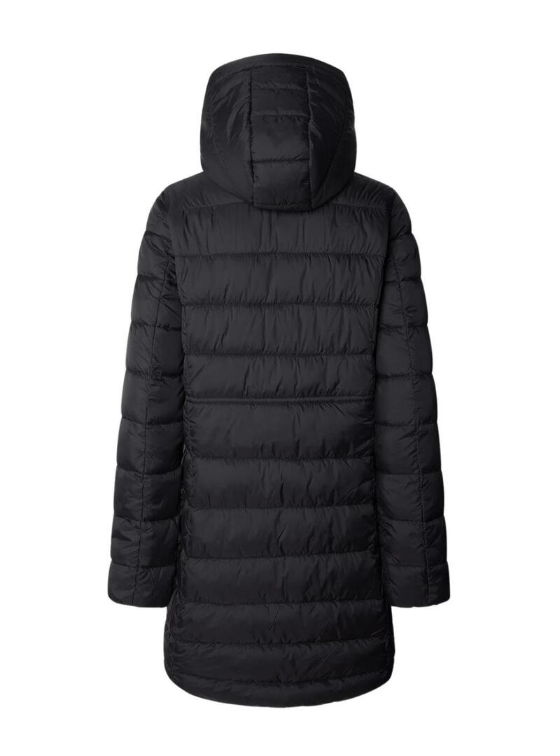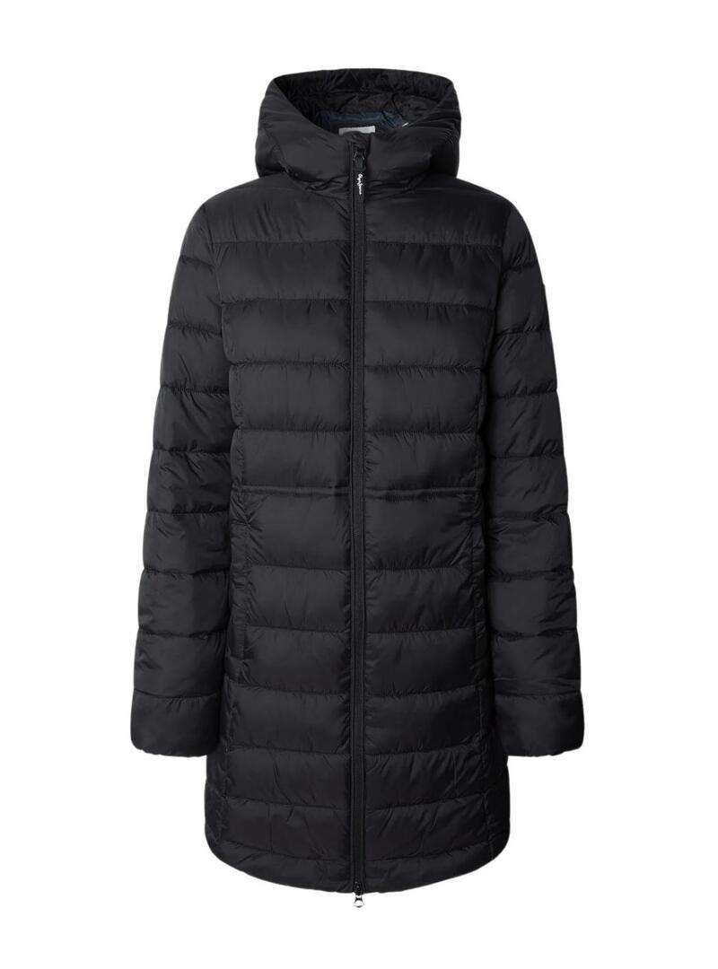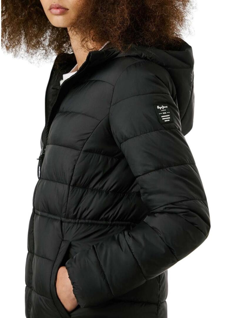 Piumino Pepe Jeans. Taglio lungo. Tessuto impermeabile. Imbottito. Con cappuccio. Colore nero. Collo alto. Chiusura a zip bidirezionale. Zip con logo in rilievo. Tasche laterali. Logo stampato sul petto. Vita regolabile all'interno. Patch in gomma con logo su una manica. La modella indossa la taglia S.