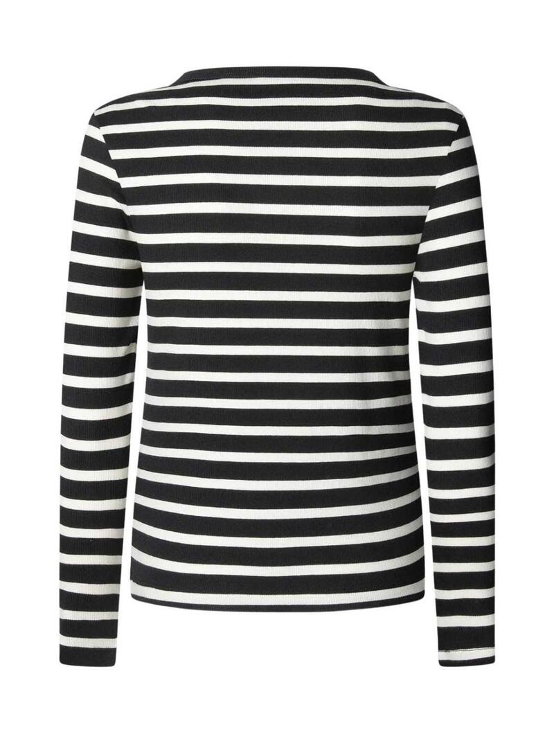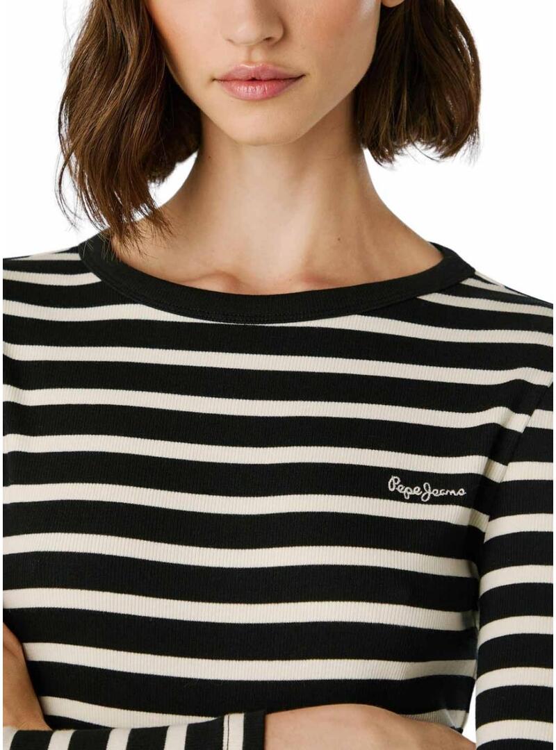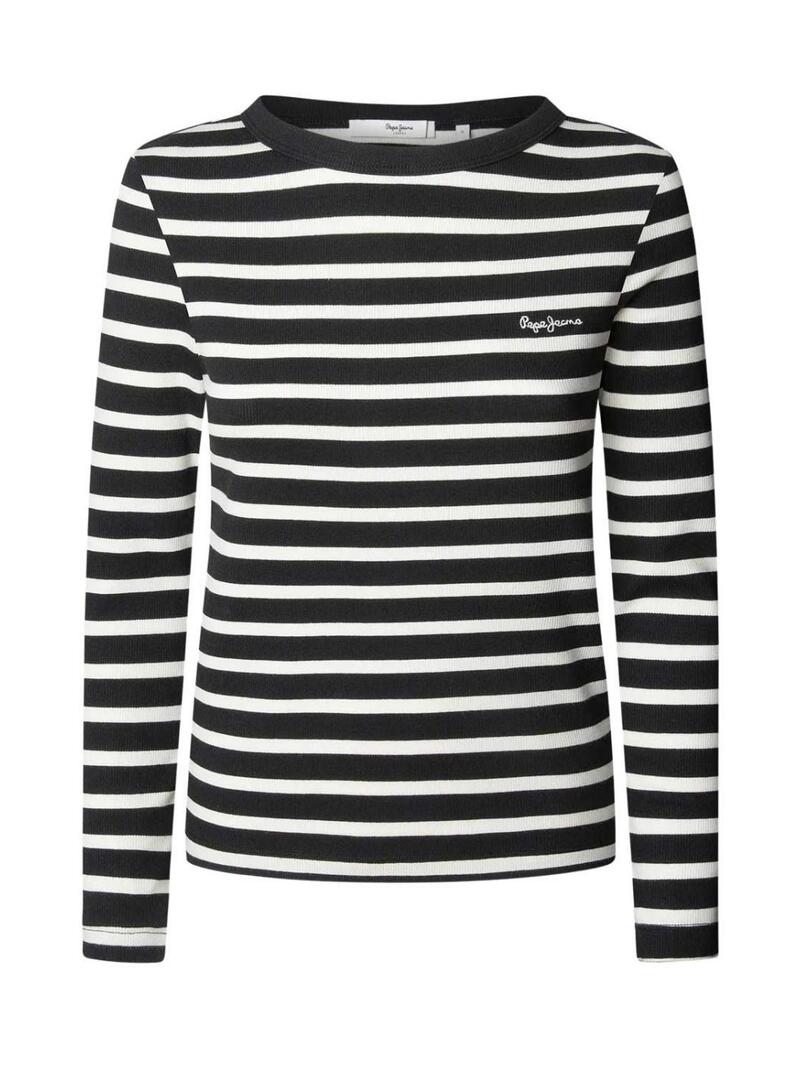 Maglietta Pepe Jeans. Tessuto a coste. Manica lunga. Stampato a righe bicolori. Bianco e nero. Collo rotondo. Logo ricamato sul petto. Finitura a doppia cucitura. La modella indossa la taglia S.