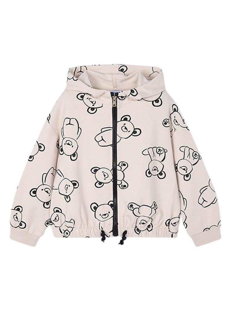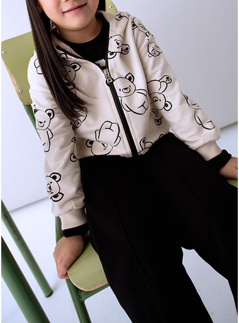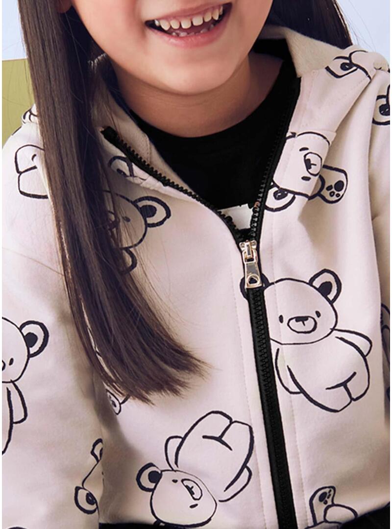 Tuta Mayoral. Tre pezzi. Felpa manica lunga. Collo con cappuccio. Chiusura anteriore con cerniera. Coulisse regolabile in fondo. Pantaloni con vita elastica. Pantaloni beige con fondo elastico e tasche laterali.