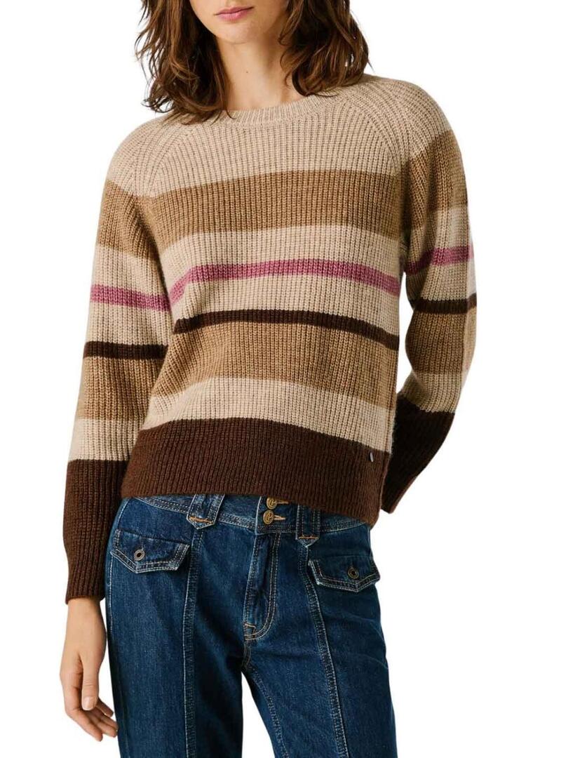 Maglia a righe Pepe Jeans. Colletto rotondo. Manica lunga raglan. Realizzato in lana. Finiture a coste. La modella indossa la taglia S.