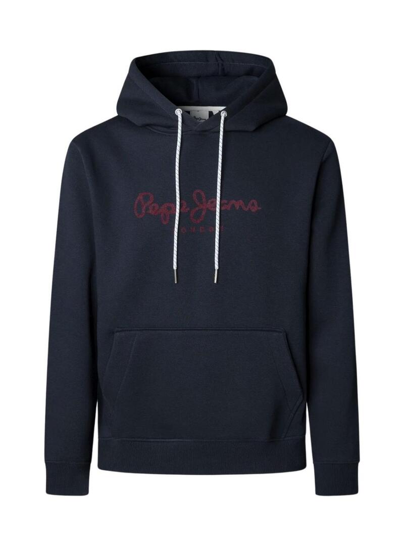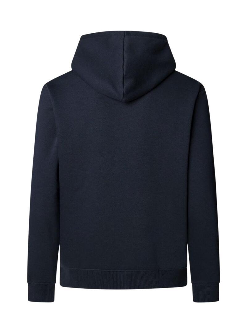 Felpa Pepe Jeans. Colore blu scuro. Manica lunga. Logo rosso sul petto. Con cappuccio regolabile con lacci. Tasca a marsupio. Etichetta con logo cucita sul lato. Finiture a costine. Il modello indossa la taglia M.