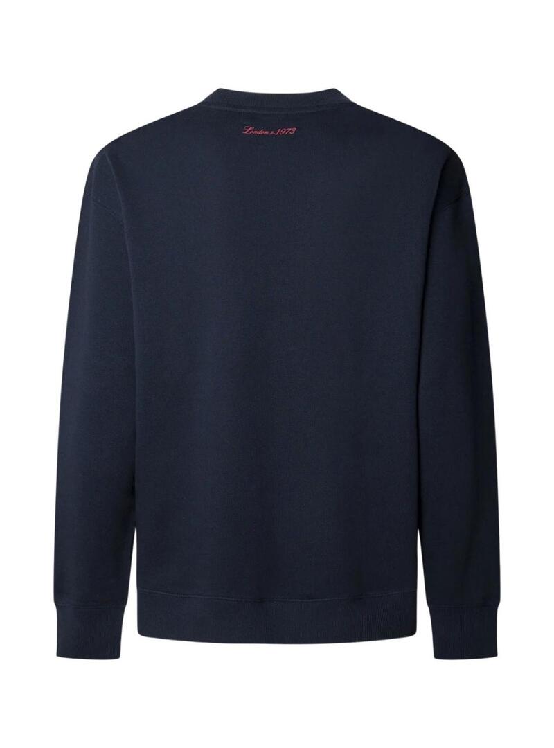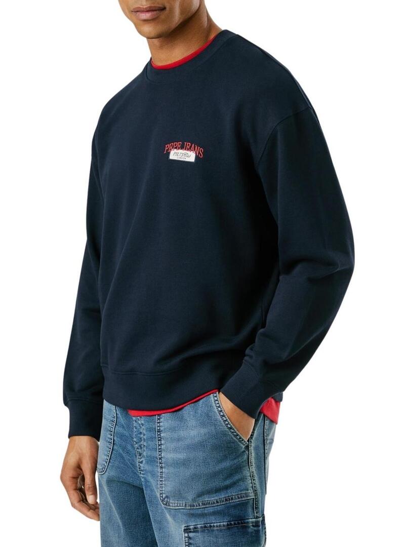 Felpa Pepe Jeans. Colore blu scuro. Maniche lunghe. Collo rotondo. Logo Pepe Jeans ricamato sul petto. Finiture a costine. Nastro bicolore all'interno del collo. Logo sulla parte posteriore. Il modello indossa la taglia M.
