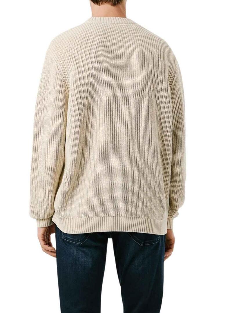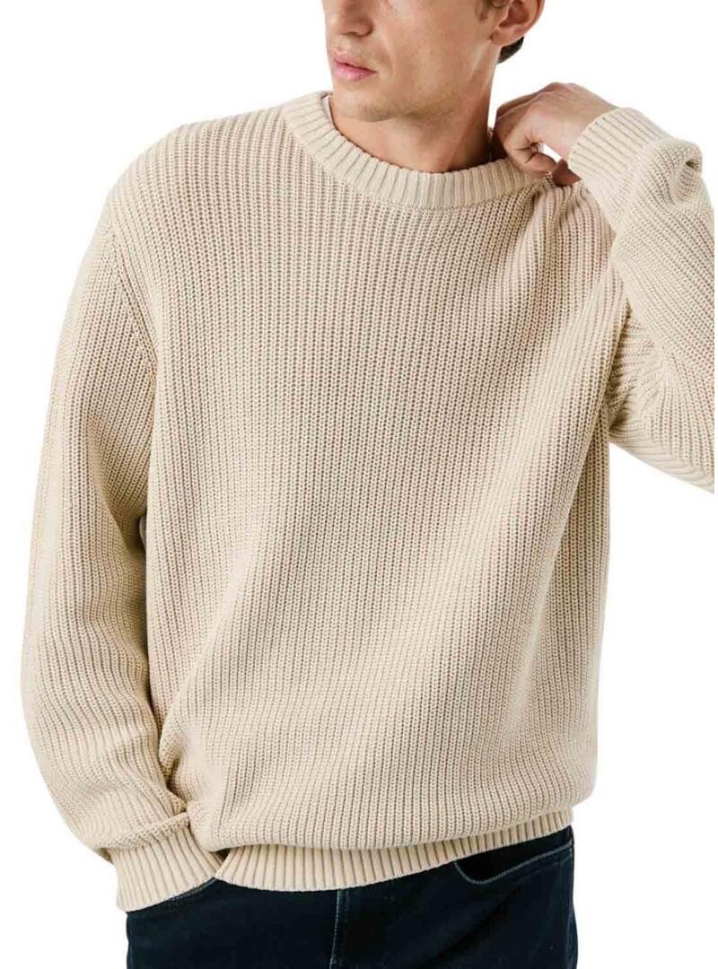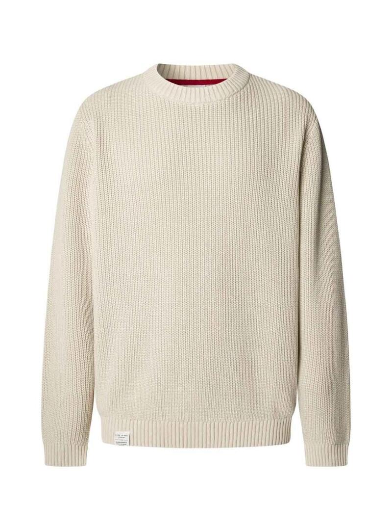 Felpa Pepe Jeans. Colore beige. Maniche lunghe. Girocollo. Vestibilità regolare. Tessuto a coste. Etichetta del marchio in basso. Il modello indossa la taglia M.