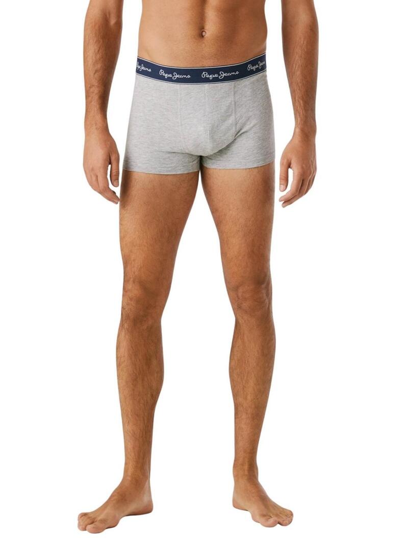 Pacco da 3 slip Pepe Jeans. Boxer in tessuto di cotone elasticizzato. Vita regolare. Uno con stampa con loghi del marchio. Due tinta unita in colore blu marino e grigio. Vita con logo del marchio. Gamba corta.