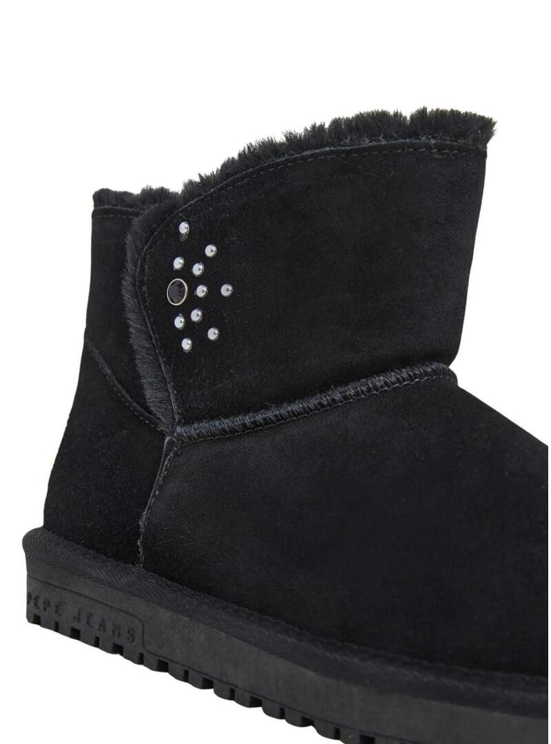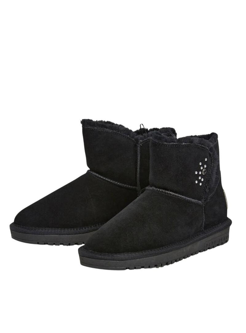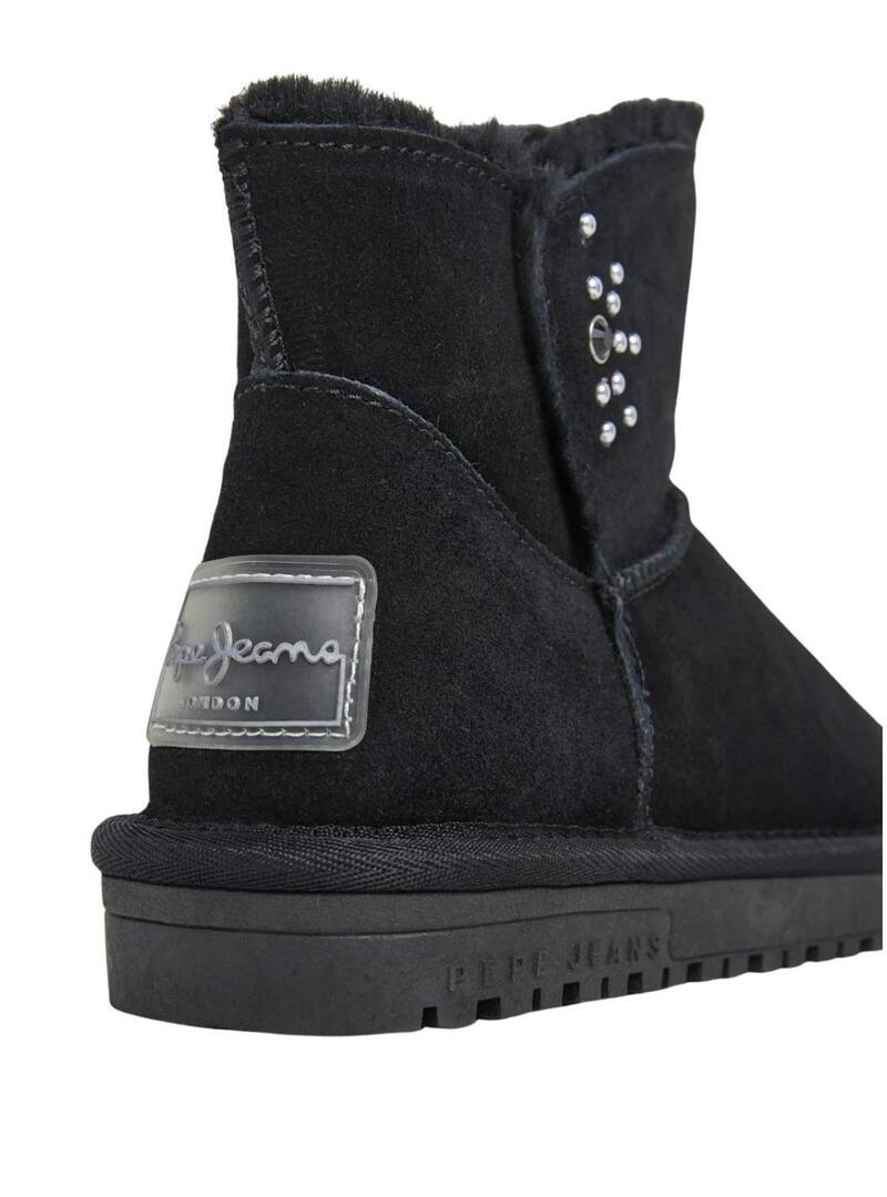 Stivaletti Pepe Jeans. Colore nero. Tessuto scamosciato. Gambale basso con linguetta sull'istep. Interno morbido con pelo. Dettaglio di borchie sul lato. Patch in gomma con il logo di Pepe Jeans in rilievo sul tallone. Suola in gomma termoplastica antiscivolo.