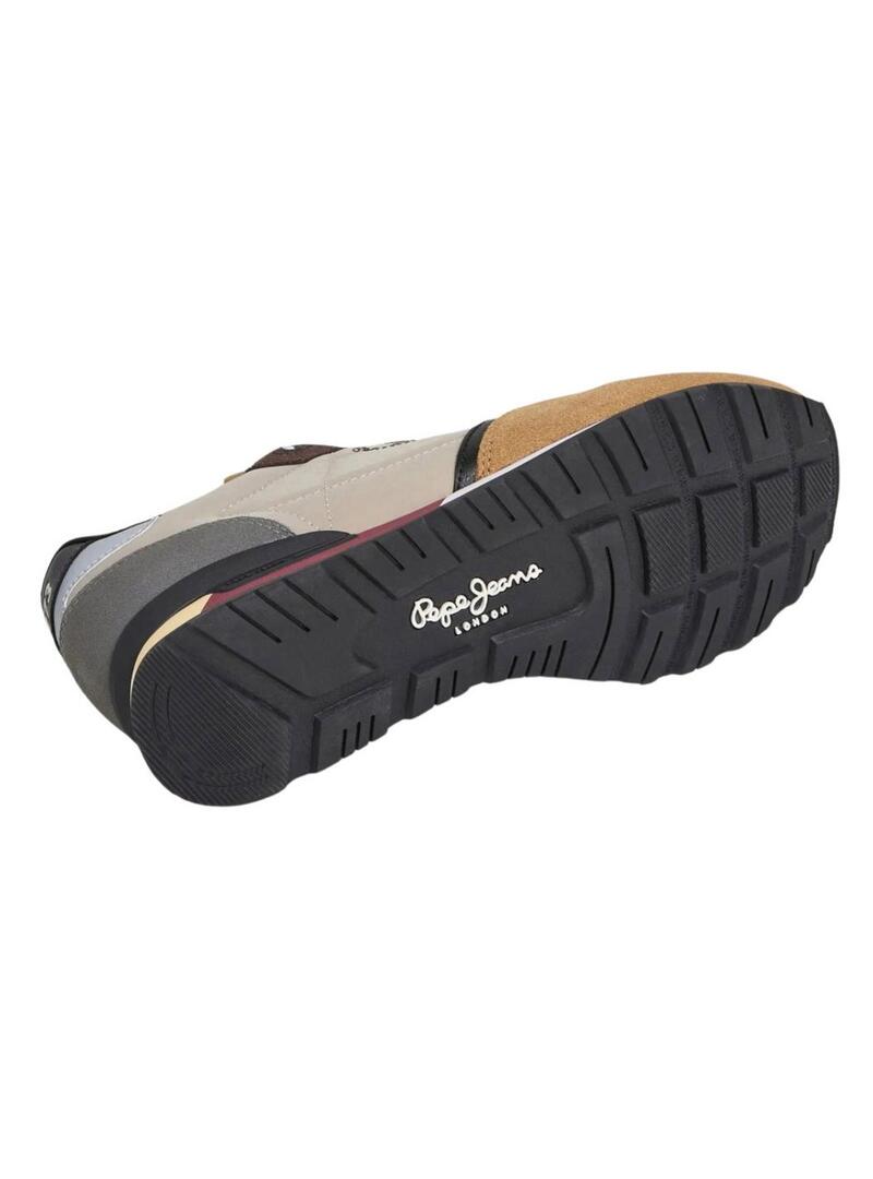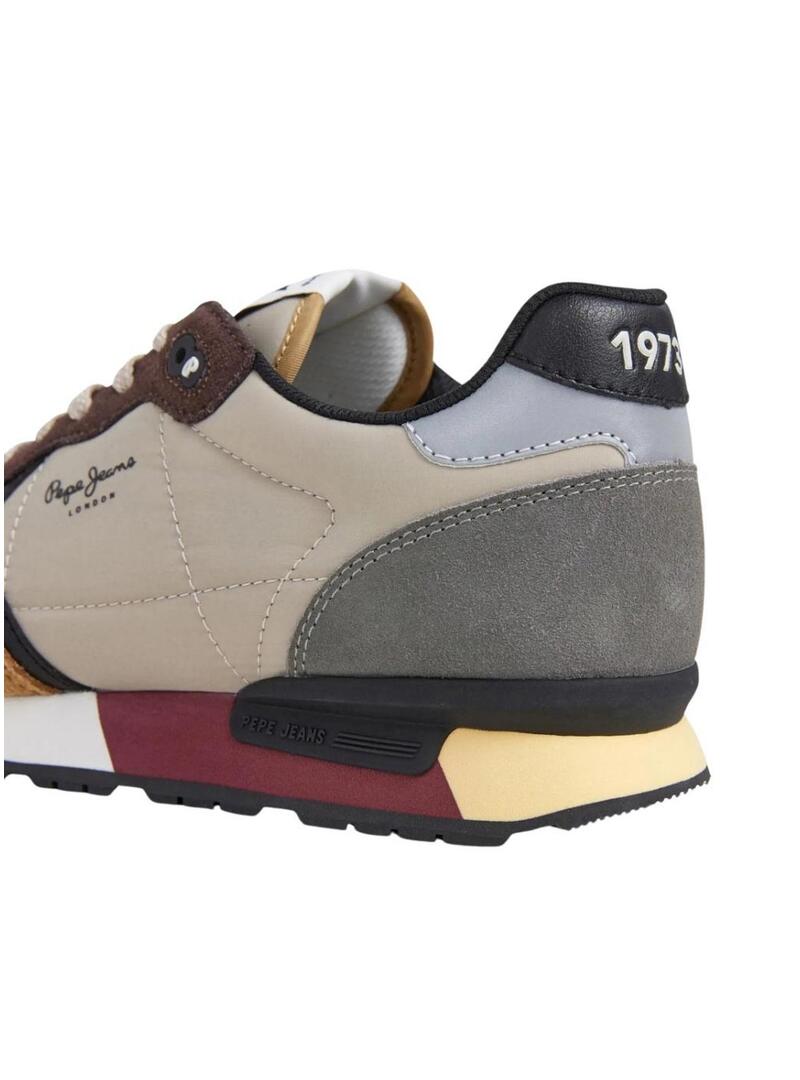 Scarpa Pepe Jeans. Stile retrò running. Colore beige. Parte superiore combinata. Soletta estraibile e termoformata. Intersuola tricolore in EVA. Suola in gomma. Stabilizzatore e occhiello personalizzati. Logo 1973 sul tallone. Logo Pepe Jeans sul lato.