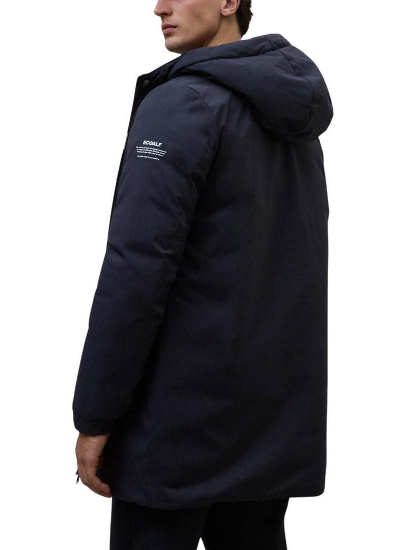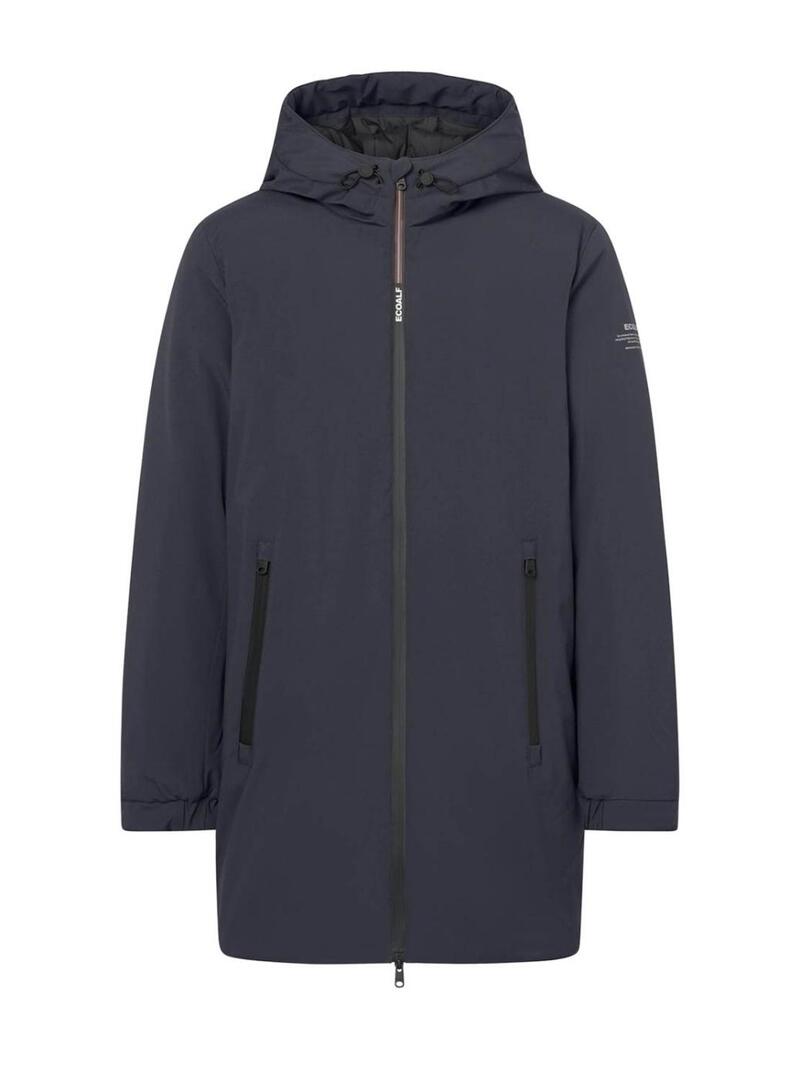 Cappotto Ecoalf. Modello Pau. Colore blu navy. Taglio regolare. Lunghezza sopra il ginocchio. Chiusura anteriore con zip. Tasche frontali con zip. Cappuccio regolabile con cordini. Tasca interna con zip. Logo del marchio su una manica. Repellente all'acqua. Tessuto impermeabile e traspirante. Senza Pfc.