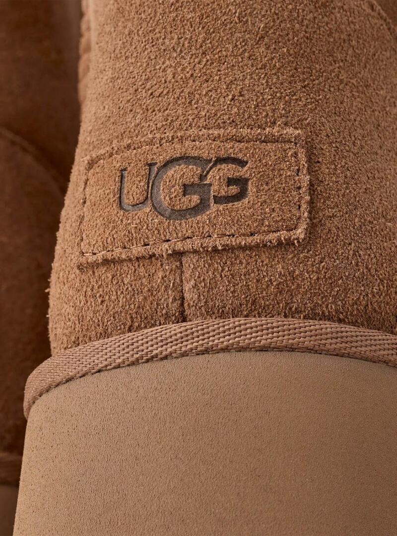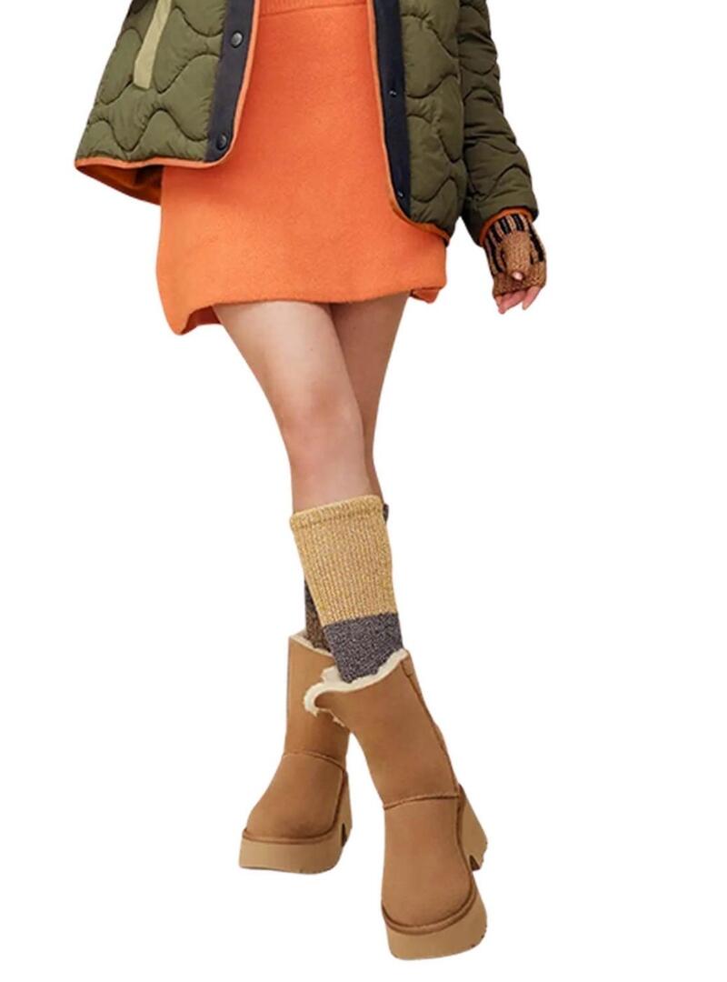 Stivali UGG. Modello Esmee. Colore cammello. Gambale alto con possibilità di piegarsi. Tomaia in pelle di pecora Twinface da 10 mm. Fodera e soletta UGGplush da 17 mm composte al 60% da lana riciclata e al 40% da lyocell TENCEL per maggiore morbidezza e comfort. Rifiniture tessili realizzate con fibre di poliestere al 100% riciclato. Suola New Heights in EVA SugarSole ultraleggera derivata dalla canna da zucchero. Platform da 7 cm e altezza del gambale di 7,6 cm. Logo UGG termo-inciso sul lato. Sistema di taglie europee.